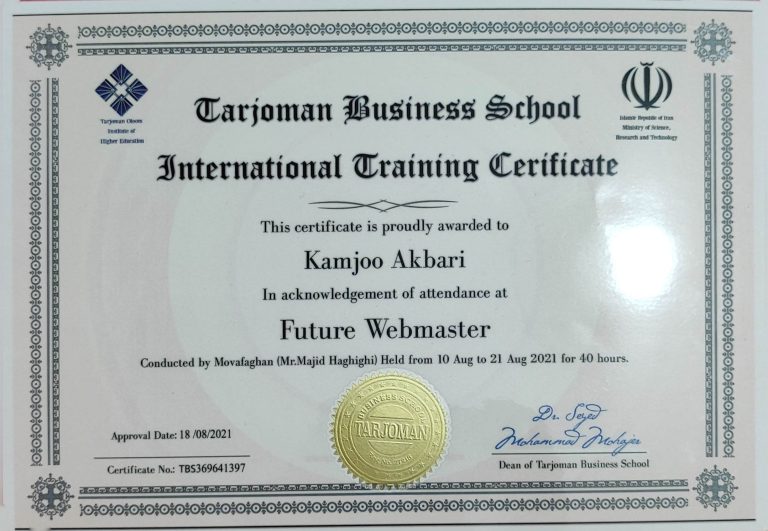 گذراندن دوره وب مستر به مدت ۴۰ ساعت و دریافت مدرک از ترجمان علوم.